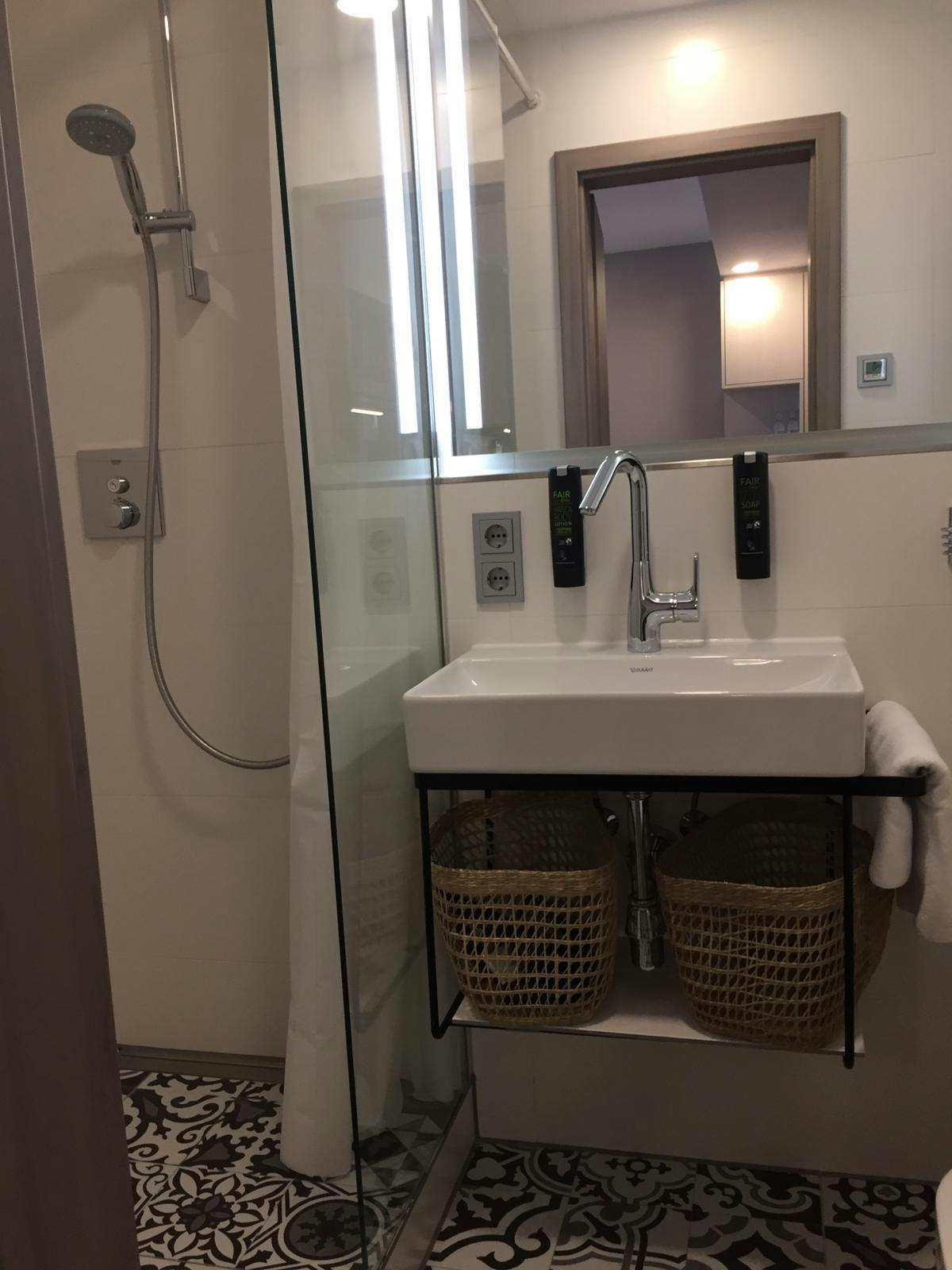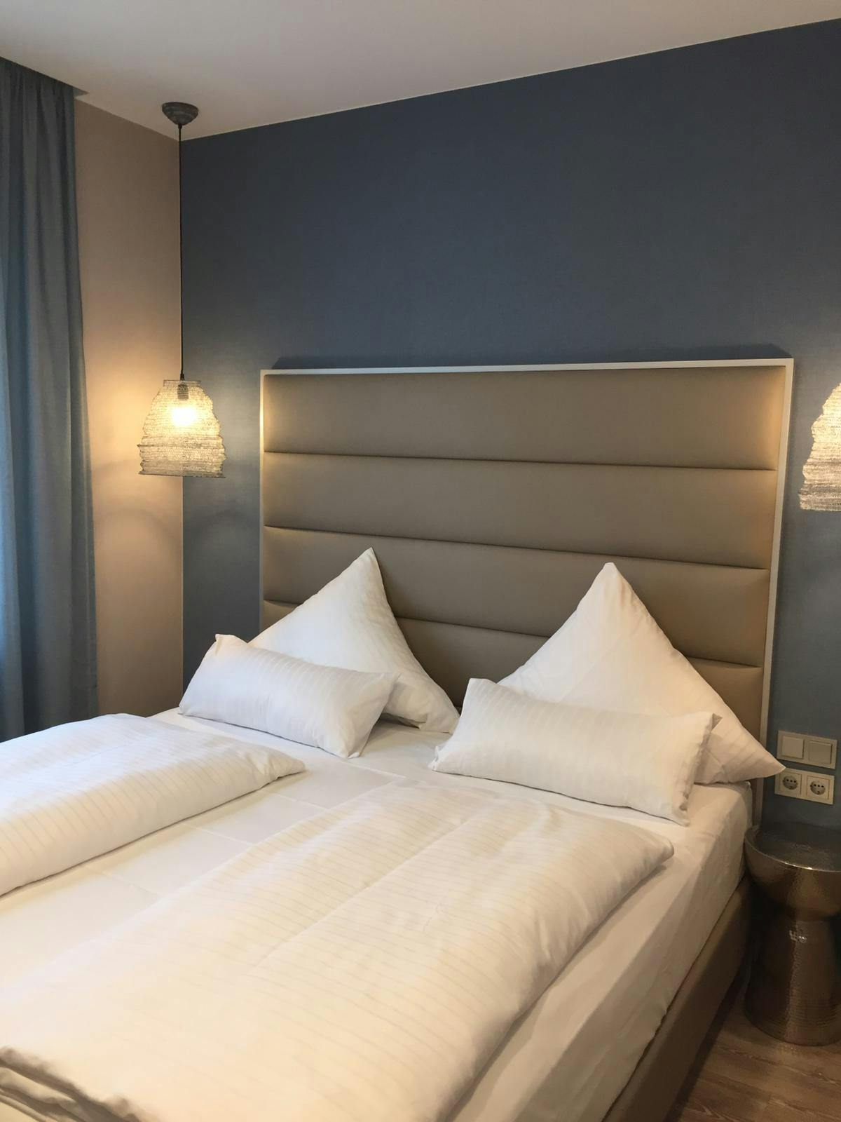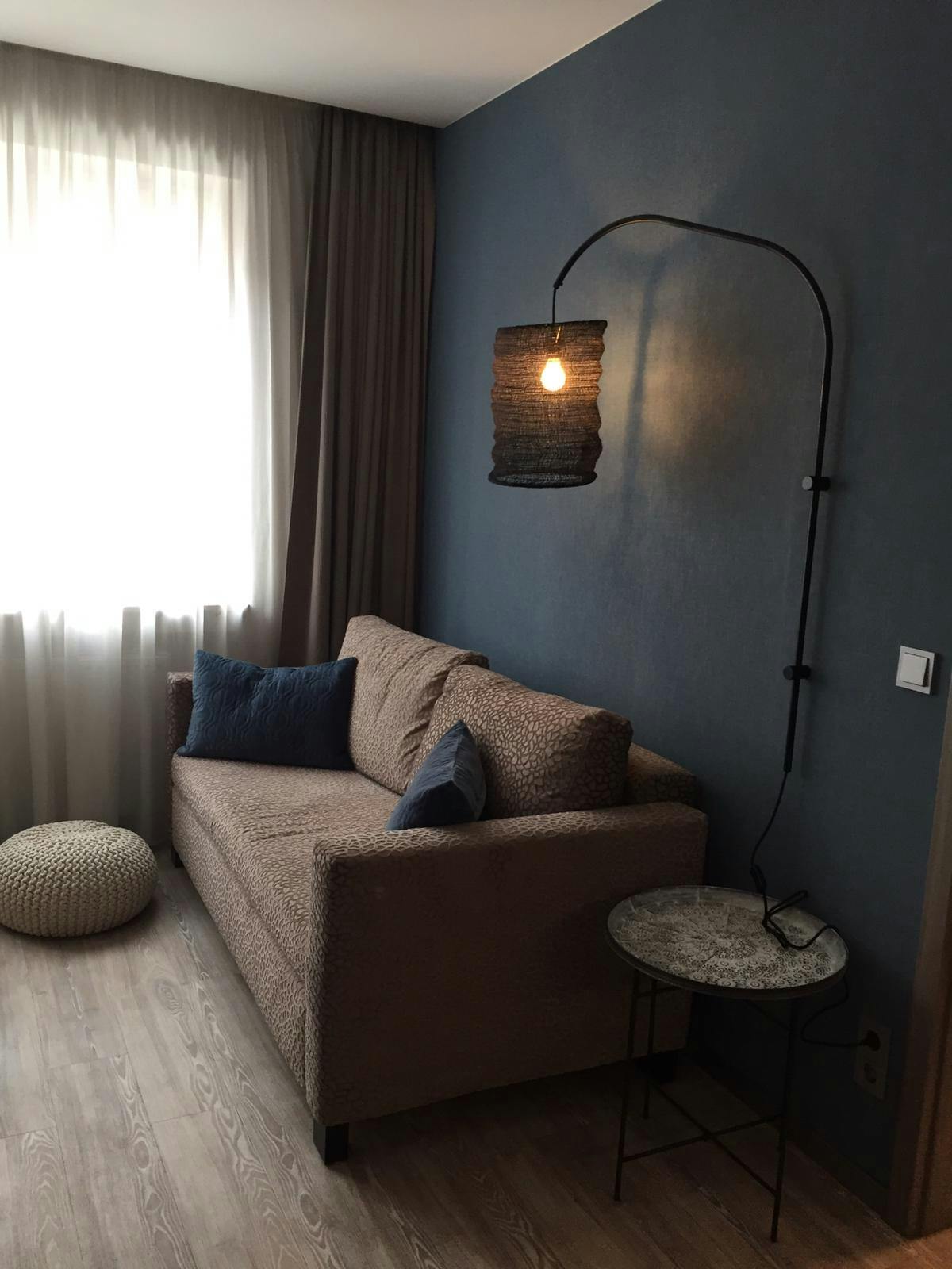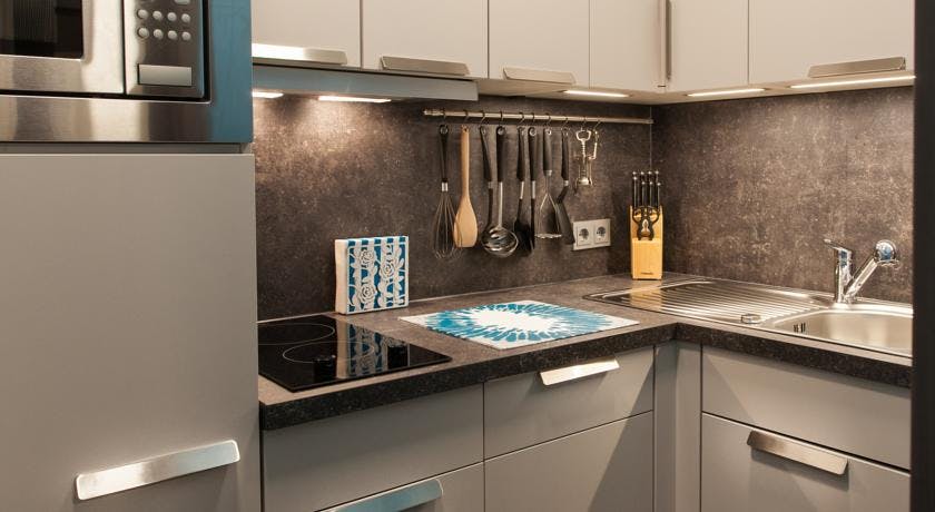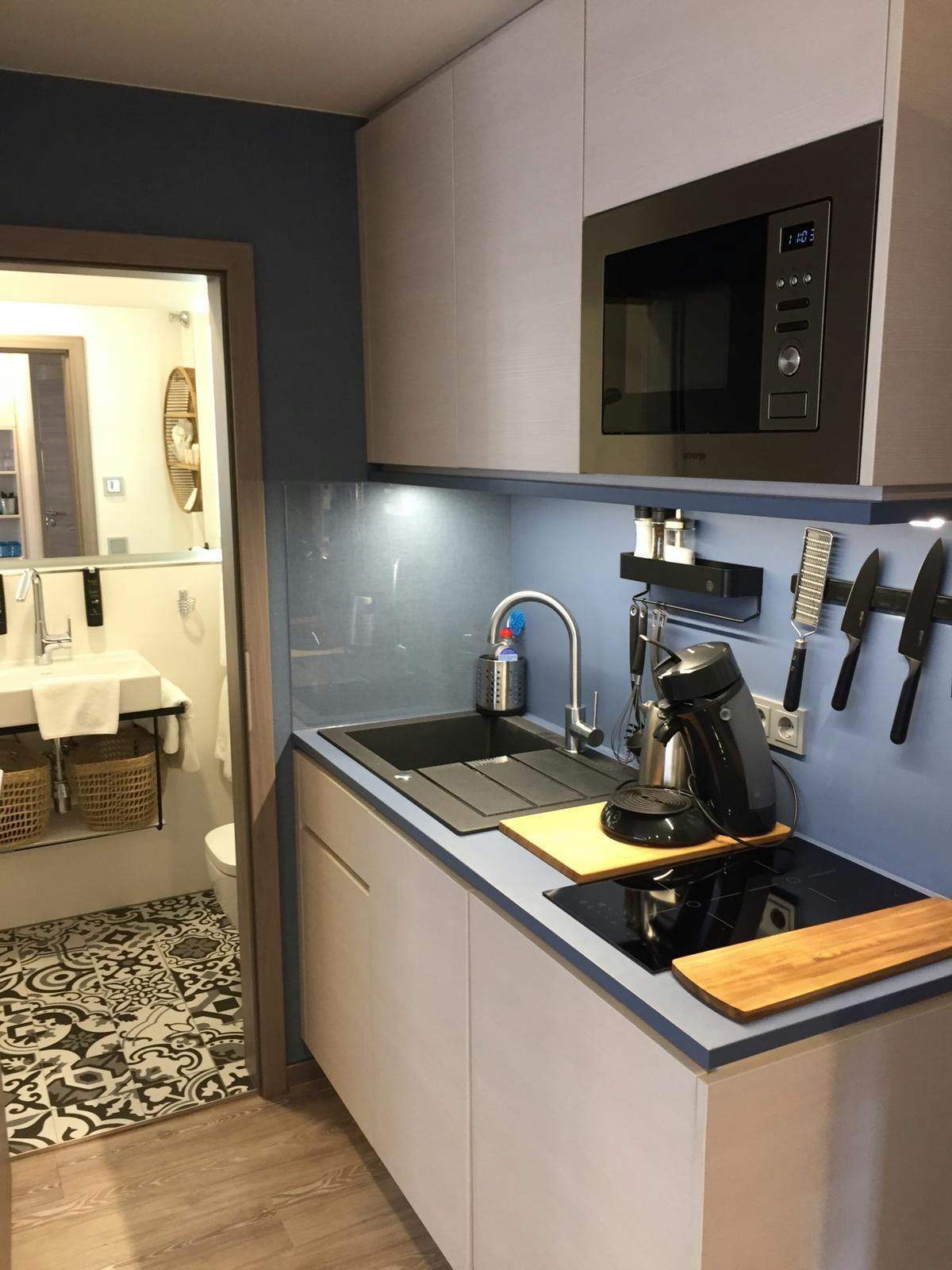 This apartment features a bedroom, kitchen and a living room with a sofa bed.